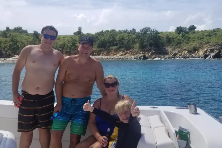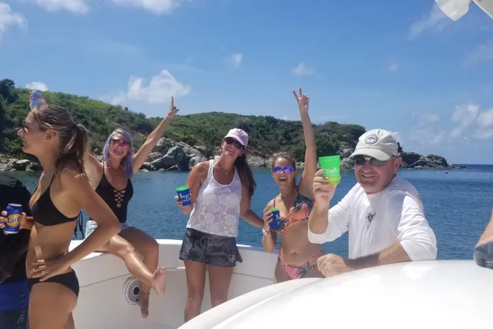 M/V Poseidon is a 36’ TwinVee known for its speed and stability while still maintaining comfort and allowing guests to stay dry. It truly is the most comfortable powerboat on the island. Poseidon has everything you need for a private charter for up to 12 guests. Swim with the turtles and see amazing fish and colorful coral using our provided snorkel equipment. Its low draft and transom ladder allow us to drop you within a few feet of most beaches. Poseidon features a Fusion Bluetooth stereo to listen to your favorite tunes. For lunch and libations, cruise to Maho Crossroads, Lovango, Sun & Sea Bar & Grill, Lime Out or any of the many beach bars and restaurants in the islands.